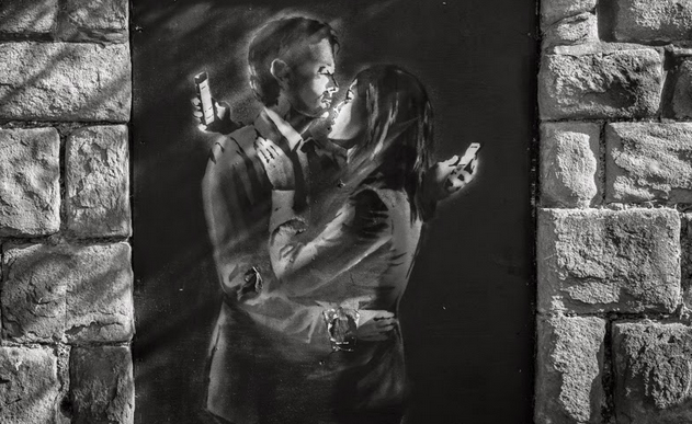 In recent times he has been a little quiet but has resurfaced again in his home town of Bristol with his “Mobile Lovers” that was found on the door of a youth club in the city. The image depicts a man and a woman in an embrace whilst staring over each other’s left shoulder at their own mobile phone.